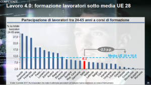 Queste competenze digitali risultano essenziali da sviluppare per gestire al meglio il rischio di disoccupazione tecnologica e per massimizzare le nuove opportunità lavorative. E’ necessario formare i lavoratori digitali ma in questo l’Italia risulta ancora indietro. La percentuale di lavoratori che hanno partecipato a corsi di formazione è di 2,5 punti percentuali al di sotto della media europea.